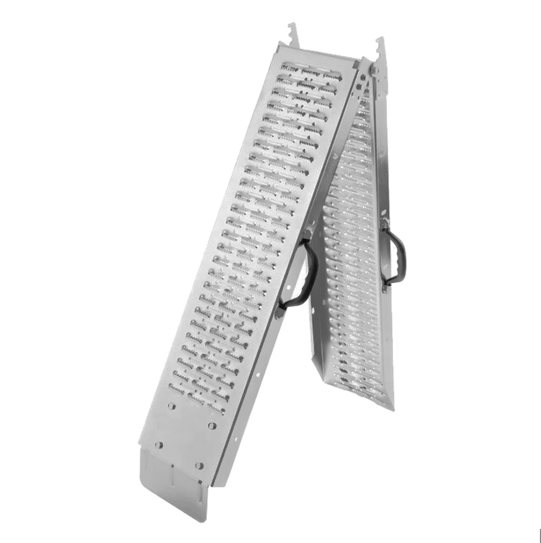 Для использования с мотоциклами, квадроциклами и при погрузке на фургоны, этот складной трап оснащен дополнительной вставкой для фиксирования на борту автомобиля. Благодаря складной структуре и удобной ручке его удобно переносить и устанавливать в ограниченных пространствах. Применение также включает бытовые и промышленные задачи, где требуется надежный и прочный трап.