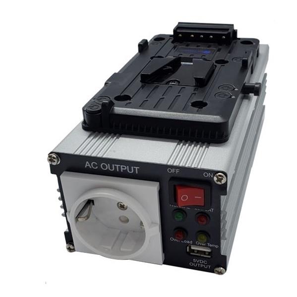 Инвертер GEN Energy G-VT300, V-Mount 230V — компактный конвертер питания с выходом 230В переменного тока мощностью до 150 Вт. Весит всего 1,06 кг, размеры 205x91x85 мм, что удобно для использования в полевых условиях. Встроена V-Mount аккумуляторная площадка для подключения 150Wh Li-ion батарей, а также USB выход 5V и 230V Schuko розетка. Важные технические параметры: эффективность более 90%, автоотключение при напряжении 12V и сигнализация о низком заряде при 12,5V.