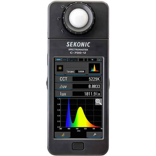 Спектрометр Sekonic C-700-U — профессиональный колориметр для точного измерения цвета и интенсивности света любых источников, от LED и HMI до флуоресцентных и импульсных вспышек. Оснащён 4,3” цветным сенсорным экраном и CMOS-сенсором с разрешением 1 нм, обеспечивающим высокоточную спектральную карту освещения. Ключевые характеристики: диапазон цветовой температуры 1600–40000K, светимость до 200000 люкс, хранение до 99 измерений, режимы подсветки для фото и кино, фильтры Rosco, Lee и Fuji, а также CC/MIRED коррекция цвета. Удобен 270° поворотный датчик и программное обеспечение для анализа данных. Совместим с камерами и осветительным оборудованием, где требуется точный контроль температуры цвета и CRI для калибровки баланса белого и коррекции цветовых сдвигов. Используется в кинематографии и фотосъёмке для оценки качества света и подготовки съемочного процесса с учётом «стопов» динамического диапазона и лог-профилей. Первый в мире спектрометр Sekonic с уникальной системой многосветовых сравнений упрощает работу с несколькими источниками света одновременно. Sekonic — совершенствуйте цветопередачу на съёмках с этим инструментом профессионального уровня.