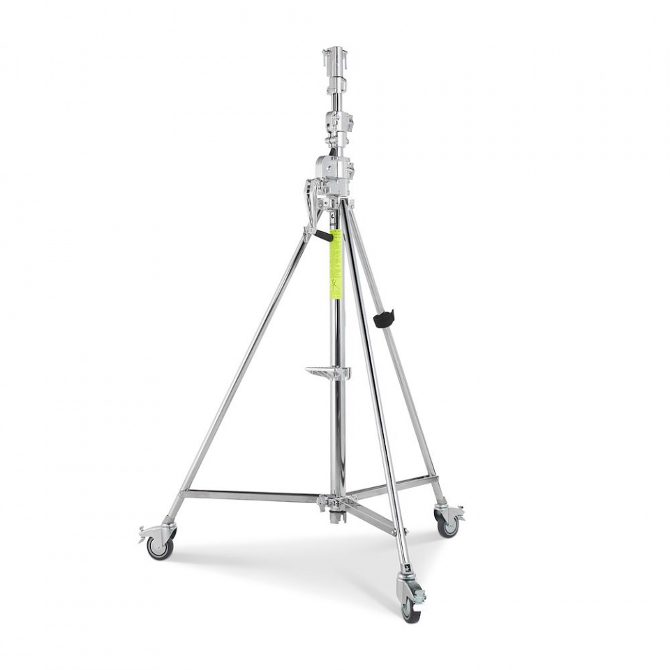 Ключевые характеристики: 3 секции с двумя подъемными элементами (Ø 55, 45, 38 мм), максимальная высота 3,83 м, закрытая длина 2,01 м, максимальная грузоподъемность 30 кг, диаметр основания 1,42 м, оснащена колесами с тормозами и нивелирующей ногой для устойчивости на неровном грунте.